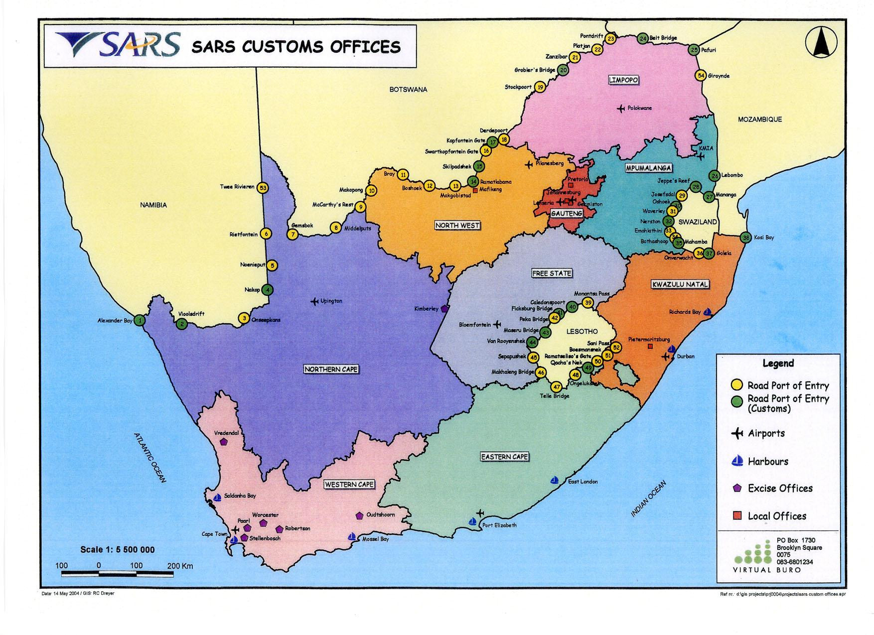 Soltanto le dogane di confine dell’Unione doganale sudafricana sono abilitate a effettuare le operazioni di riesportazione (V. carta geografica), ma non le dogane interne